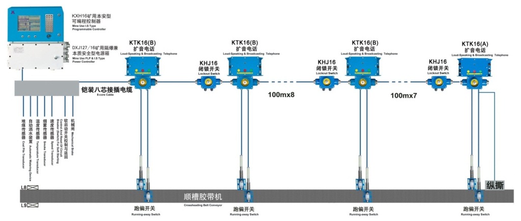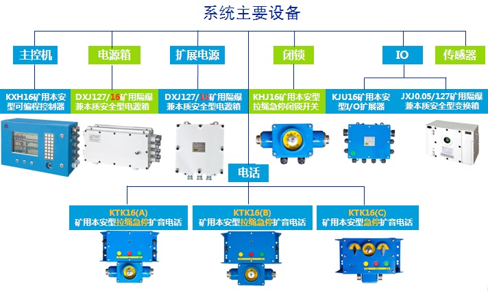 装置由KXH16矿用本安型可编程控制器、DXJ127/16矿用隔爆兼本质安全型电源箱、DXJ127/18矿用隔爆兼本安型电源箱、KJU16矿用本安型I/O扩展器、JXJ0.05/127矿用隔爆兼本质安全型变换箱、KHJ16矿用本安型拉绳急停闭锁开关、KTK16(A)矿用本安型拉绳急停扩音电话、KTK16(B)矿用本安型拉绳急停扩音电话、KTK16(C)矿用本安型急停扩音电话、各种矿用传感器、电缆等组成,其中KXH16矿用本安型可编程控制器为系统核心部分。
