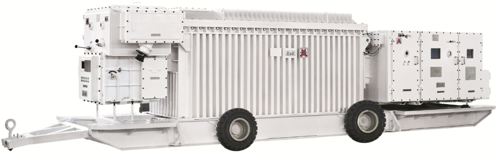 矿用隔爆兼本质安全型动力中心,适用于煤矿井下甲烷爆炸性环境中,为移动式成套设备,由高压真空开关、多绕组变压器和多电压多回路组合开关组成。一次电压10kV(或6kV),二次电压3.3 kV、1.14kV、0.66kV,向综采工作面各采、运、支设备供、变电,并提供完善可靠的控制与保护。高压侧高压真空开关、低压侧多回路组合开关,通过法兰与变压器连为一体。所有的设备都安装在平板车上,用户可以根据需要在动力中心的任意一端,方便地移动设备。