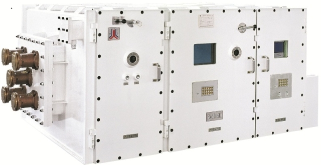 KJZ6-1800/3300(1140,660)-5、9D矿用隔爆兼本质安全型多电压真空组合开关,适用于煤矿甲烷爆炸性环境中,具备馈电开关与多回路电磁起动器功能,可同时控制交流50Hz3300V、1140V(660V)或1140V、660V多台交流电机的起、停、双速切换、顺序控制,并能对电机及线路进行保护。与多电压干式变压器通过法兰连接。