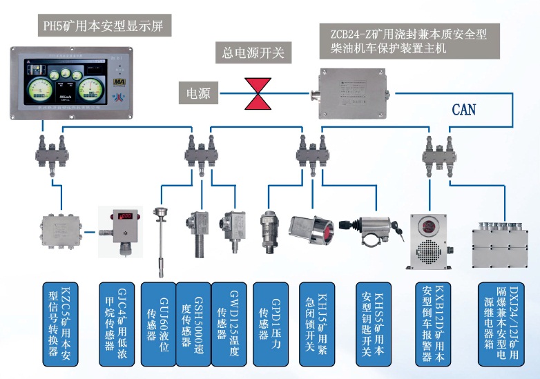 ZCB24矿用柴油机车保护装置能够实时监测矿用柴油机车的车速、转速、排温、油压、瓦斯浓度等行车参数,当参数超限或设备故障时,进行预警提示、声光报警以致熄火停车,达到控制车辆运行、实现矿用柴油机车保护的目的。本装置还具有全车传感器数据存储、导出功能,通过传感器数据历史曲线分析,可实现车辆故障预诊断,防止车辆故障扩大化。