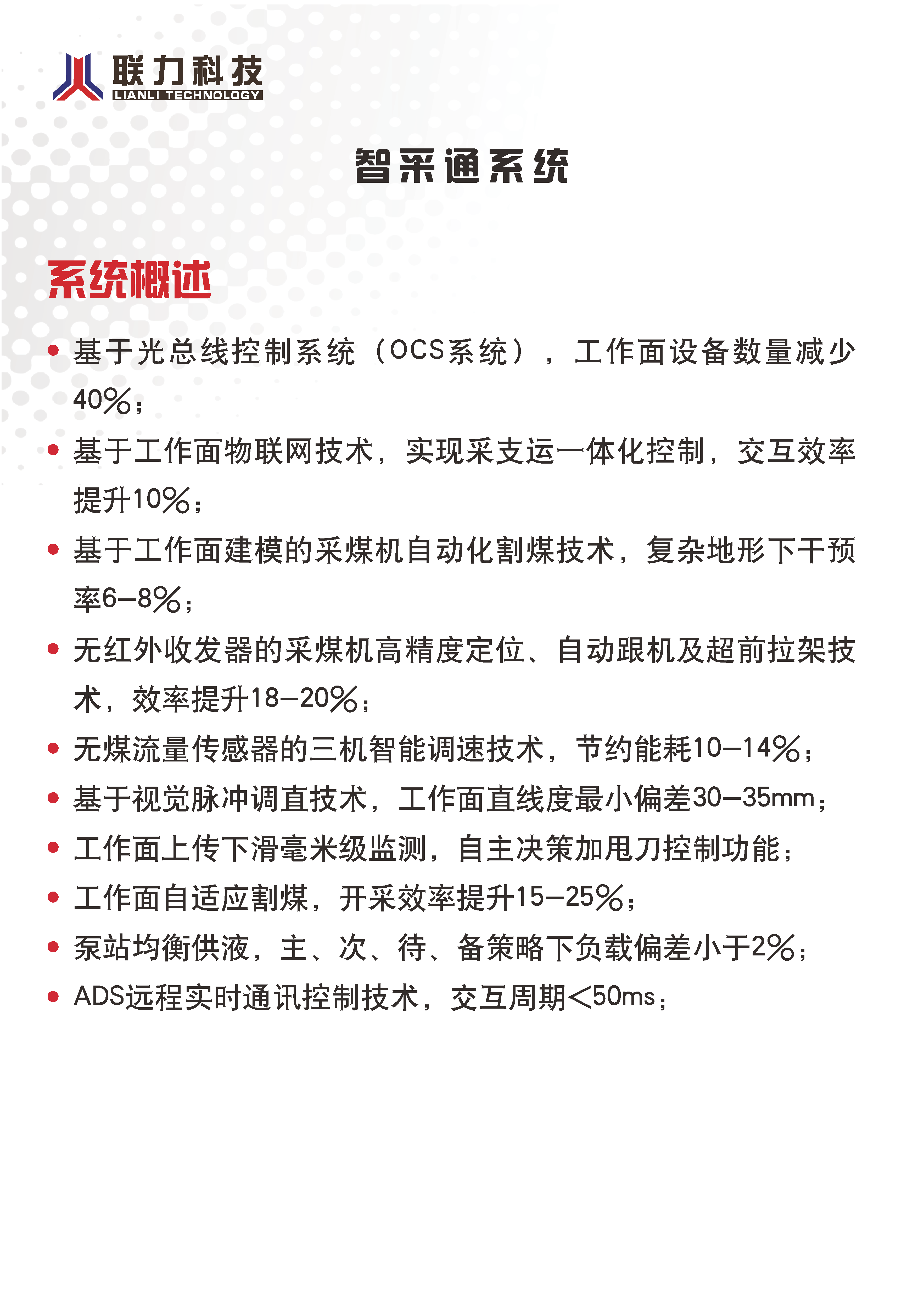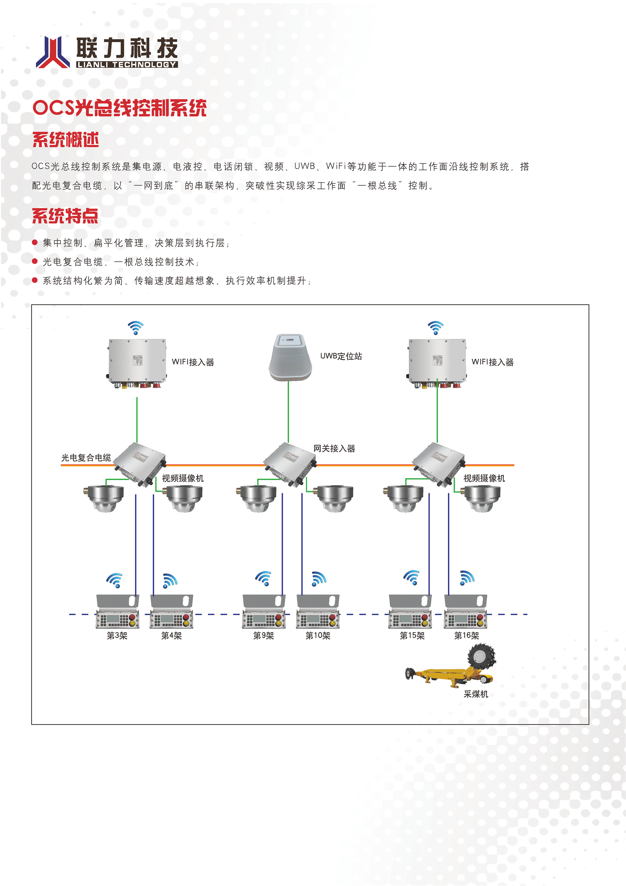 综采工作面集散控制系统 智采通系统 地面集控系统 顺槽集控系统 转载点集控系统 采煤机电控系统 三机电控系统 液压泵站控制系统 工作面通信系统 煤矿用带式输送机保护装置 无线数据传输监控系统 自移机尾(马蒂尔)自控系统 支架电液控制系统 工作面机器视觉系统 连掘面集控系统 精确人员定位系统 单轨吊推移系统 煤矿用带式输送机保护装置 工作面设备列车成套设备 设备列车推移控制系统